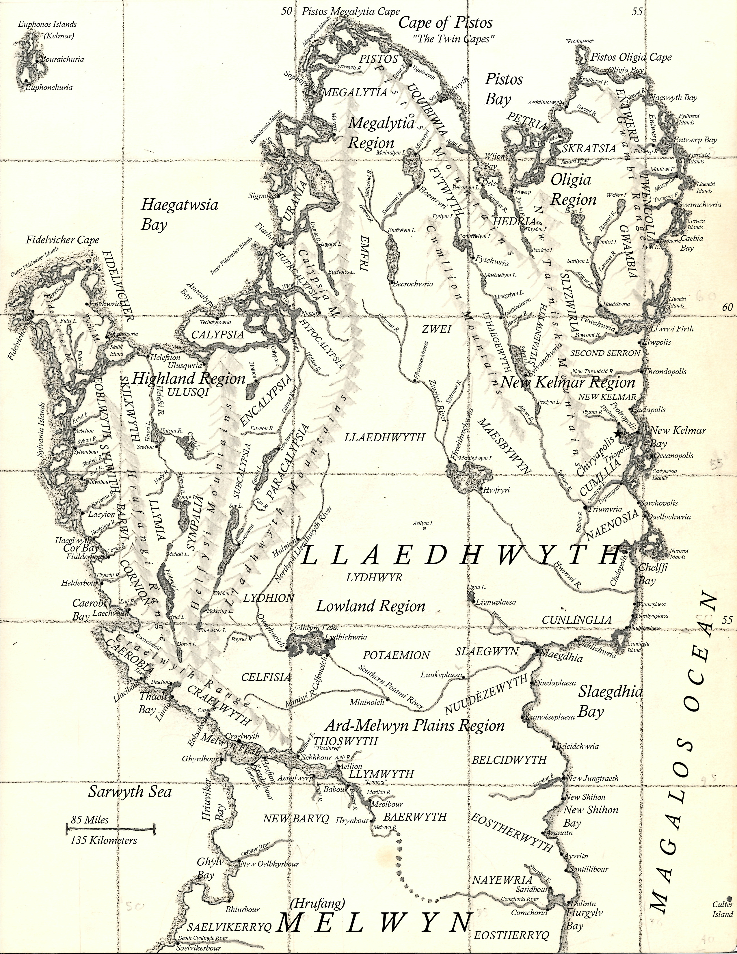This is a map of Llaedhwyth from the time of “The Gwambi Tetralogy”. I originally made this map to be published in the books, but my publisher said that there was too much information on this map, and that it would be distracting and hard to read on the page. Which, yeah, he’s right on both of those scores.